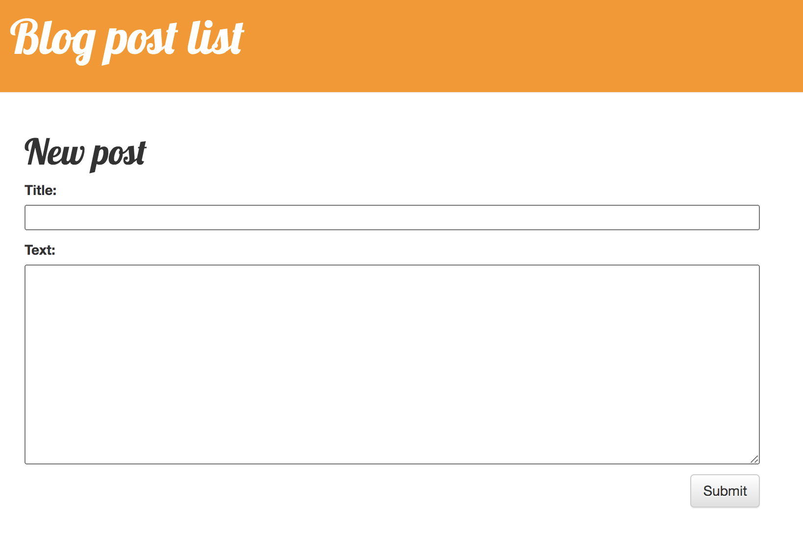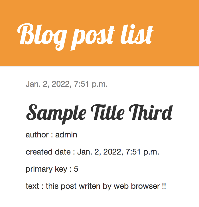이제 웹 브라우저(http://127.0.0.1:8000/)에서 포스트 작성을 진행합니다. 이전 문서에서는 폼의 내용을 입력하고 submit 하여도 아무 응답이 없었으나, 이번 문서를 잘 진행하였다면 새로운 포스트 작성이 성공적으로 진행되는 것을 확인 할 수 있습니다.