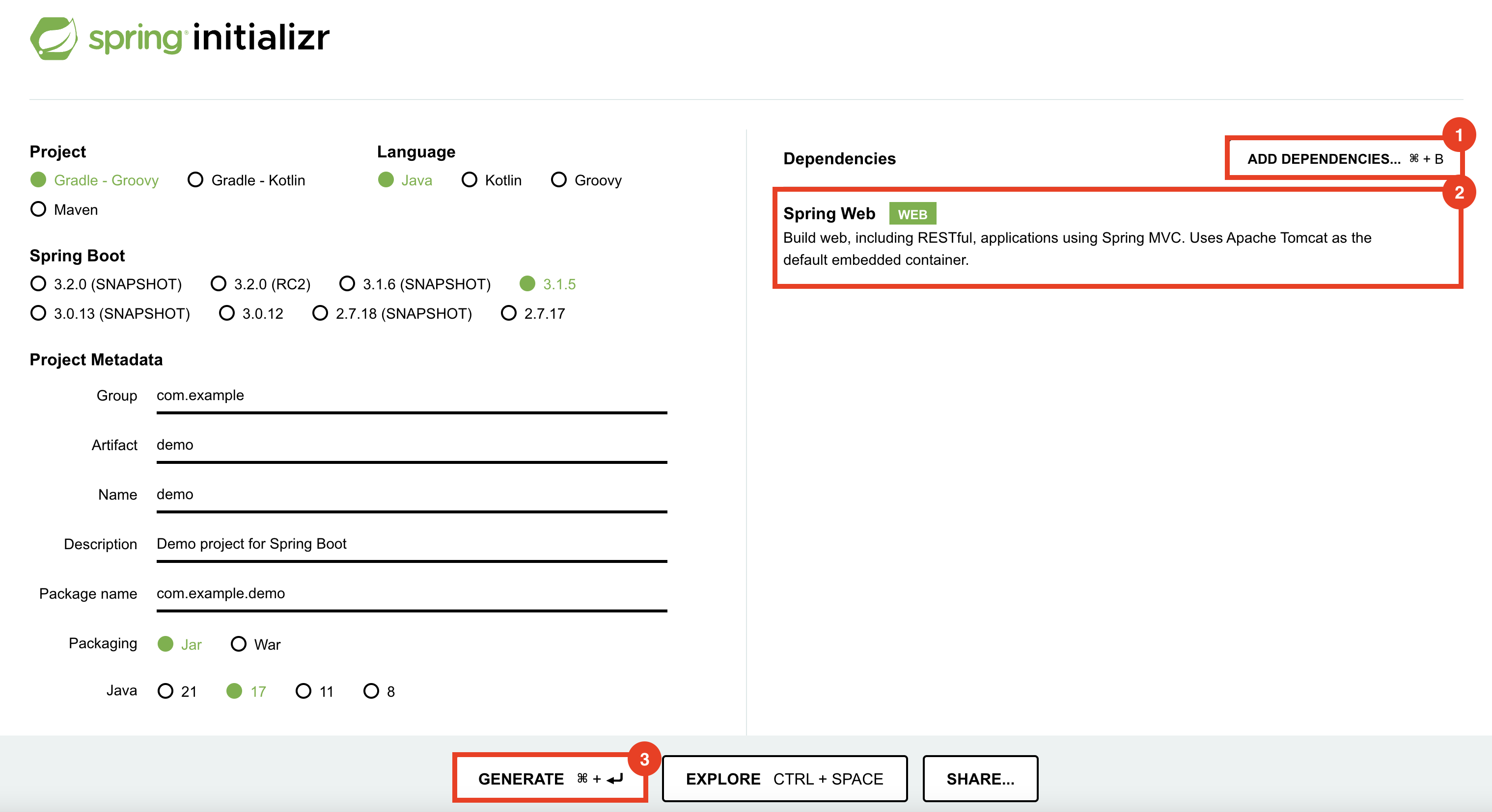 JDK 17 버전 이상을 요구합니다. @RestController는 스프링에서 웹을 통해서 호출 될 수 있는앤드포인트임을 의미합니다.@GetMapping은 어노테이션이 지정하는 URL에 의한HTTP 요청을 처리하는 메소드임을 의미합니다.@RequestParam은 HTTP 요청에 대한파라미터를 정의합니다.파라미터의 이름과 디폴트 값을 지정합니다.