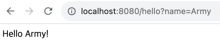 주소 창에 쿼리 스트링(Query string)을 포함하여 요청 파라미터를 처리하는 스프링 코드를 확인합니다. 예를 들어 http://localhost:8080/hello?name=Army 실행 결과는 다음과 같습니다.