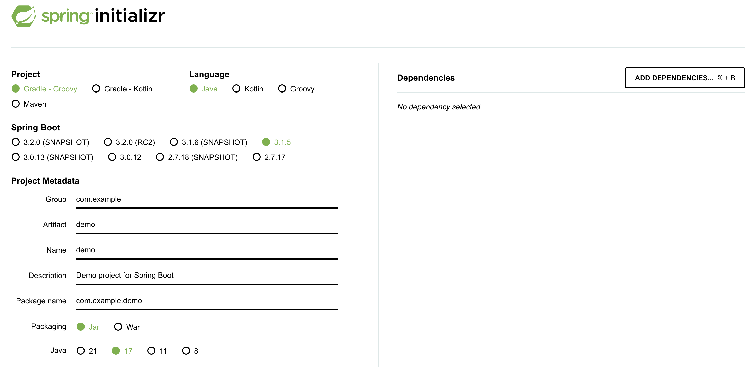 스프링 버전과 필요 모듈, 의존성 등을 선택하여 스프링 프로젝트를 쉽고 빠르게 시작 할 수 있도록 도와줍니다.