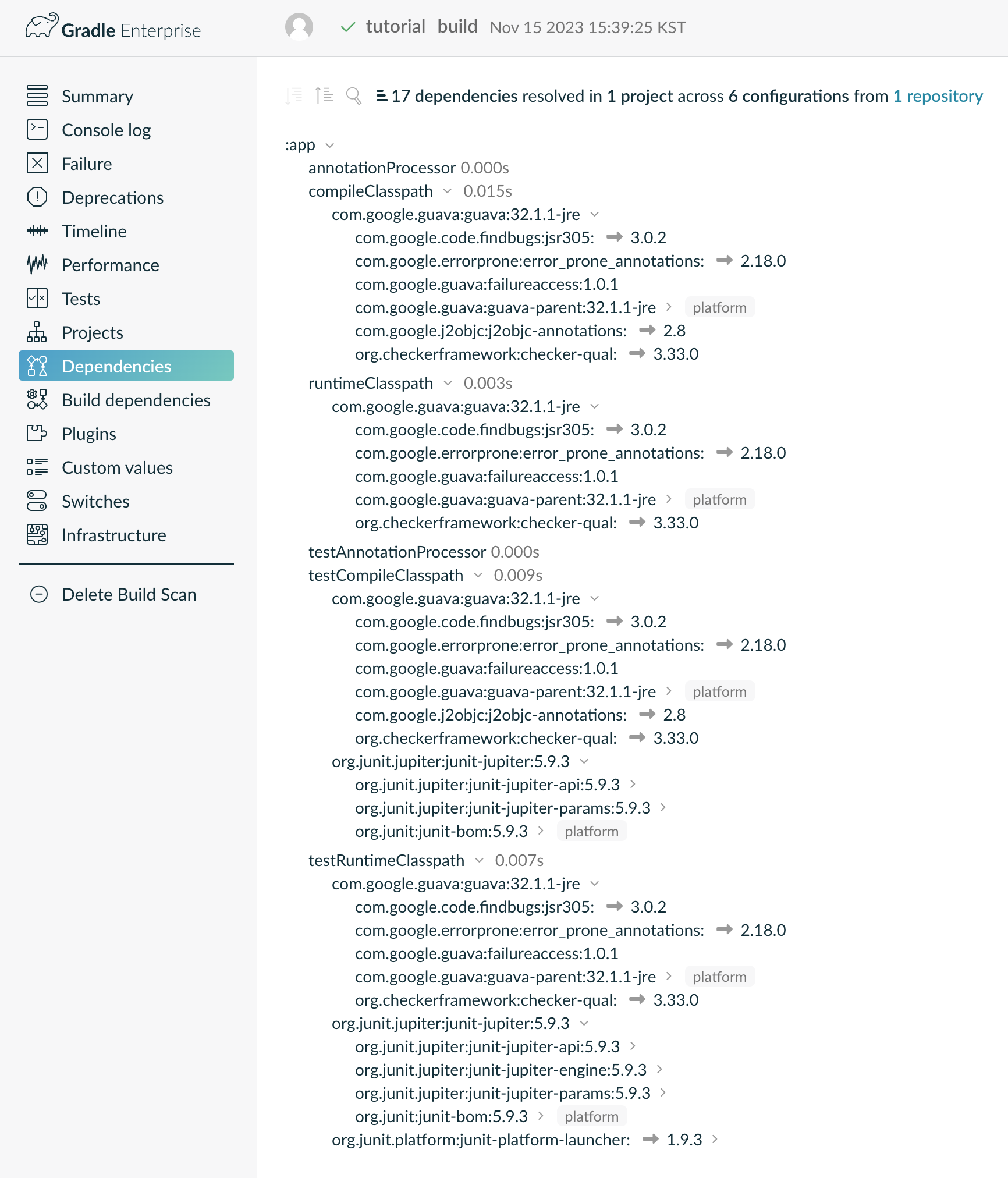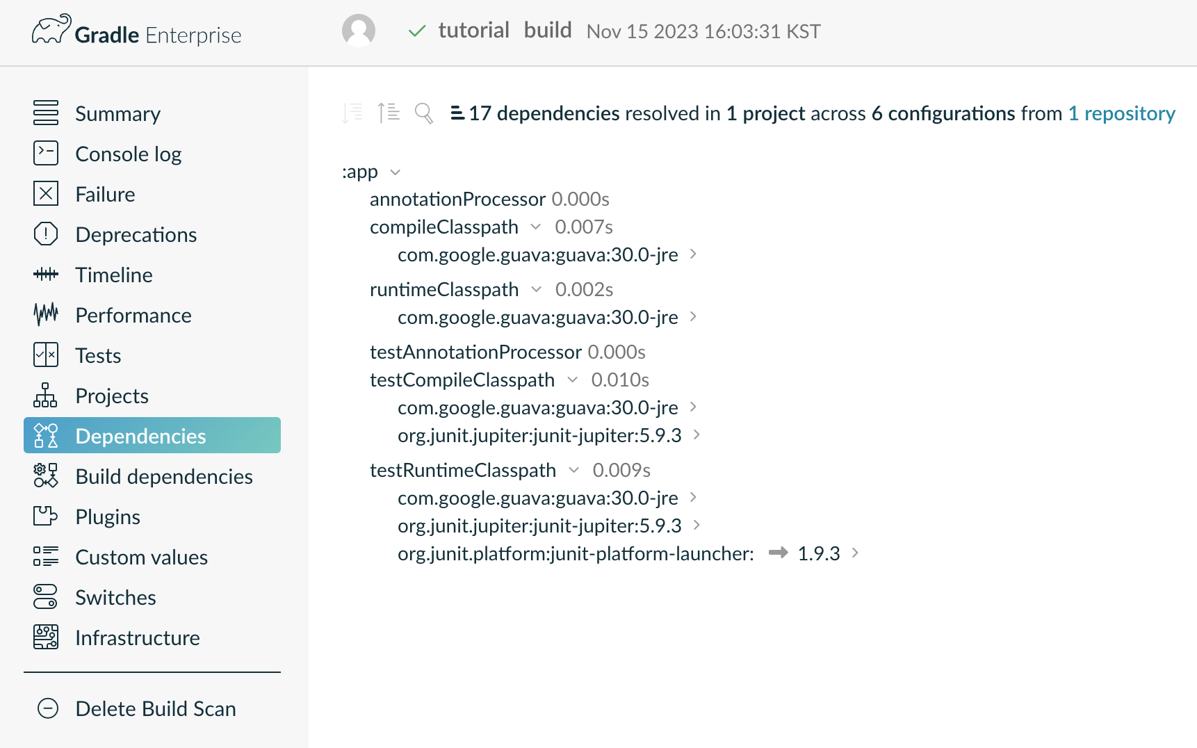 의존성을 표시하는 또 다른 방법은 빌드 스캔(Build Scan)입니다.