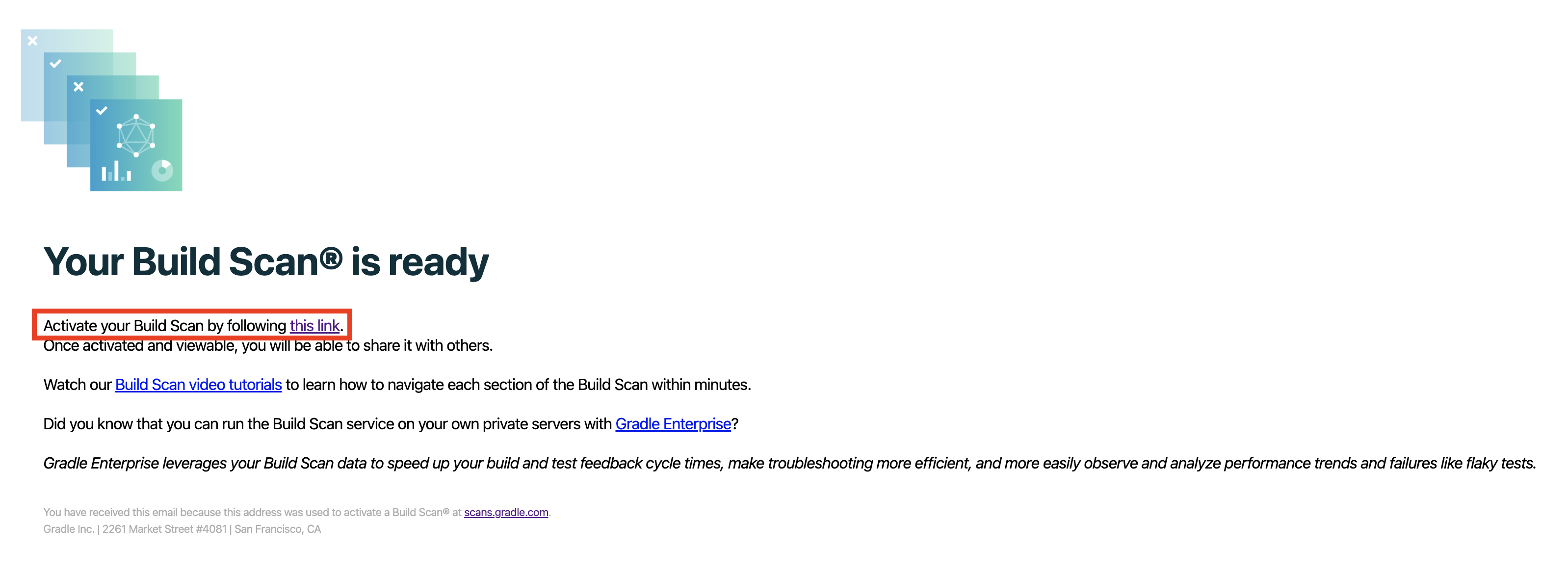 빌드 스캔과 관련된 자세한 내용은 Get started with Build Scan® for Gradle, Apache Maven™, and sbt을 참고합니다.