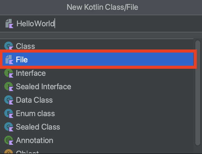 Kotlin 코드를 작성하고 HelloWorld.kt | Run 'HelloWorld.kt'로 실행합니다.