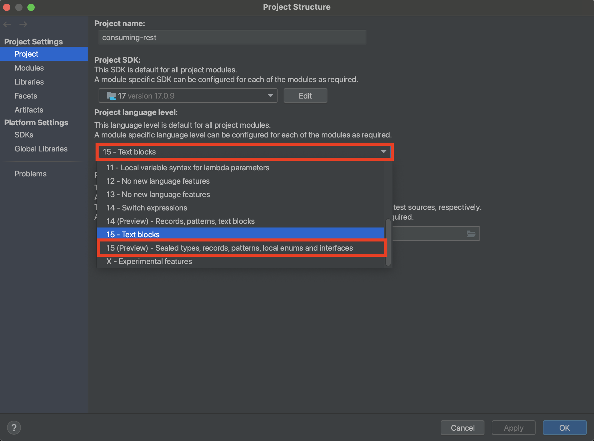 File | Project Structure | Project Settings | Project를 엽니다. Project language level을 15(Preview)로 설정합니다.