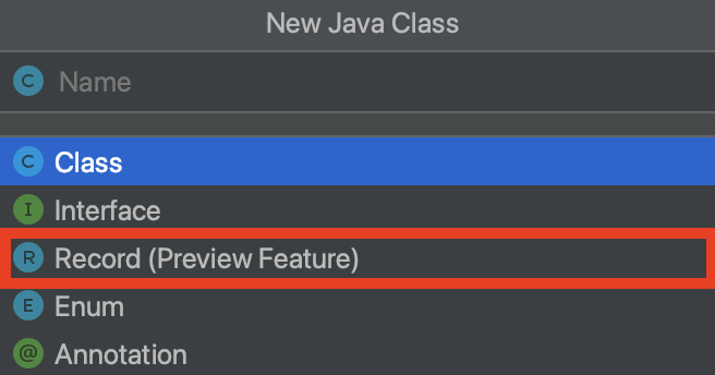 이제 Project | 패키지 우클릭 | New | Java Class에서 Record (Preview Feature)가 표시됩니다.