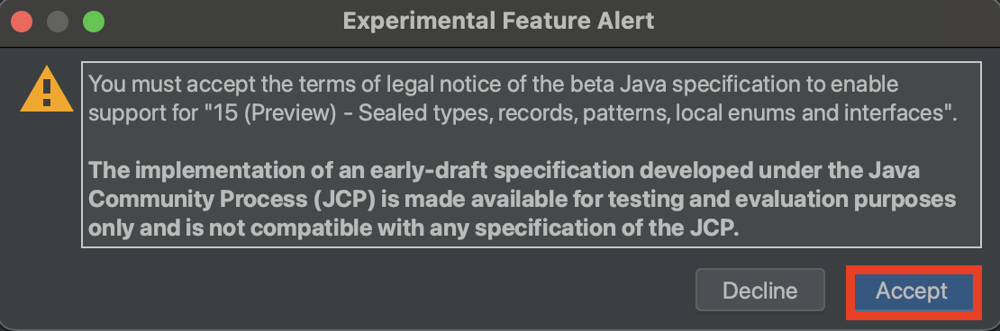 you must accept the terms of legal notice of the beta Java specification to enable support for "15 (Preview) - Sealed types, records, patterns, local enums and interfaces".