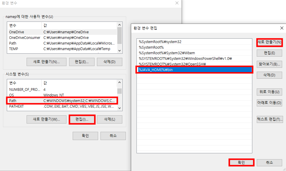 환경 변수 편집 창이 열리면 새로 만들기를 클릭하고 %JAVA_HOME%\bin을 입력합니다.